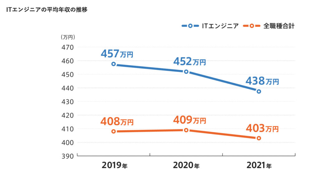 ① については、2021年の全体の年収が403万円に対して、ITエンジニアの平均年収は438万円と、35万円も差があります。
